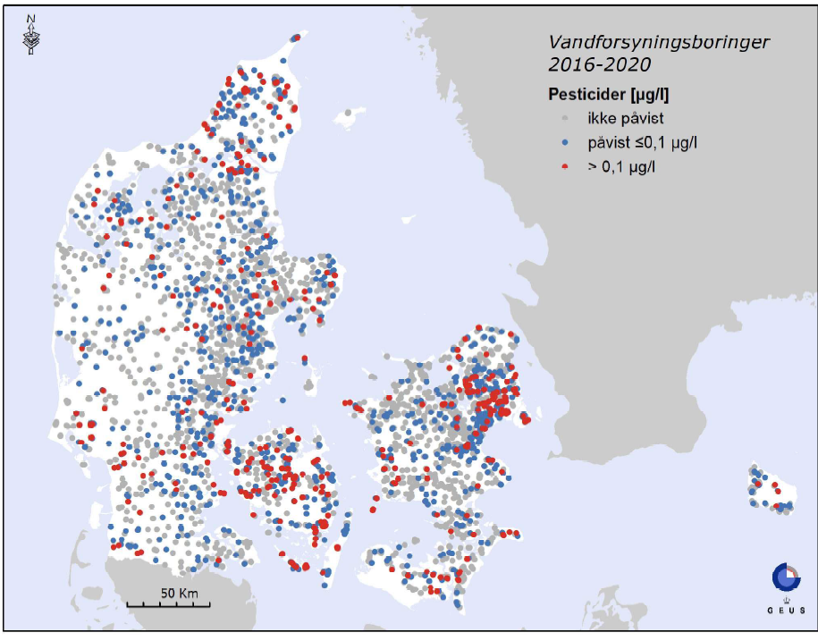 1990: Danmarks Geologiske Undersøgelser, DGU, præsenterer den første datagennemgang, som viser, at der er pesticider eller nedbrydningsprodukter i 7 procent af de undersøgte boringer. Det skaber vild diskussion. Mange mener, at er der er fejl i analysemetoderne, i boringerne eller noget tredje. Men resultaterne bekræftes: Stofferne er sivet ned gennem jorden og har nået grundvandszonen.